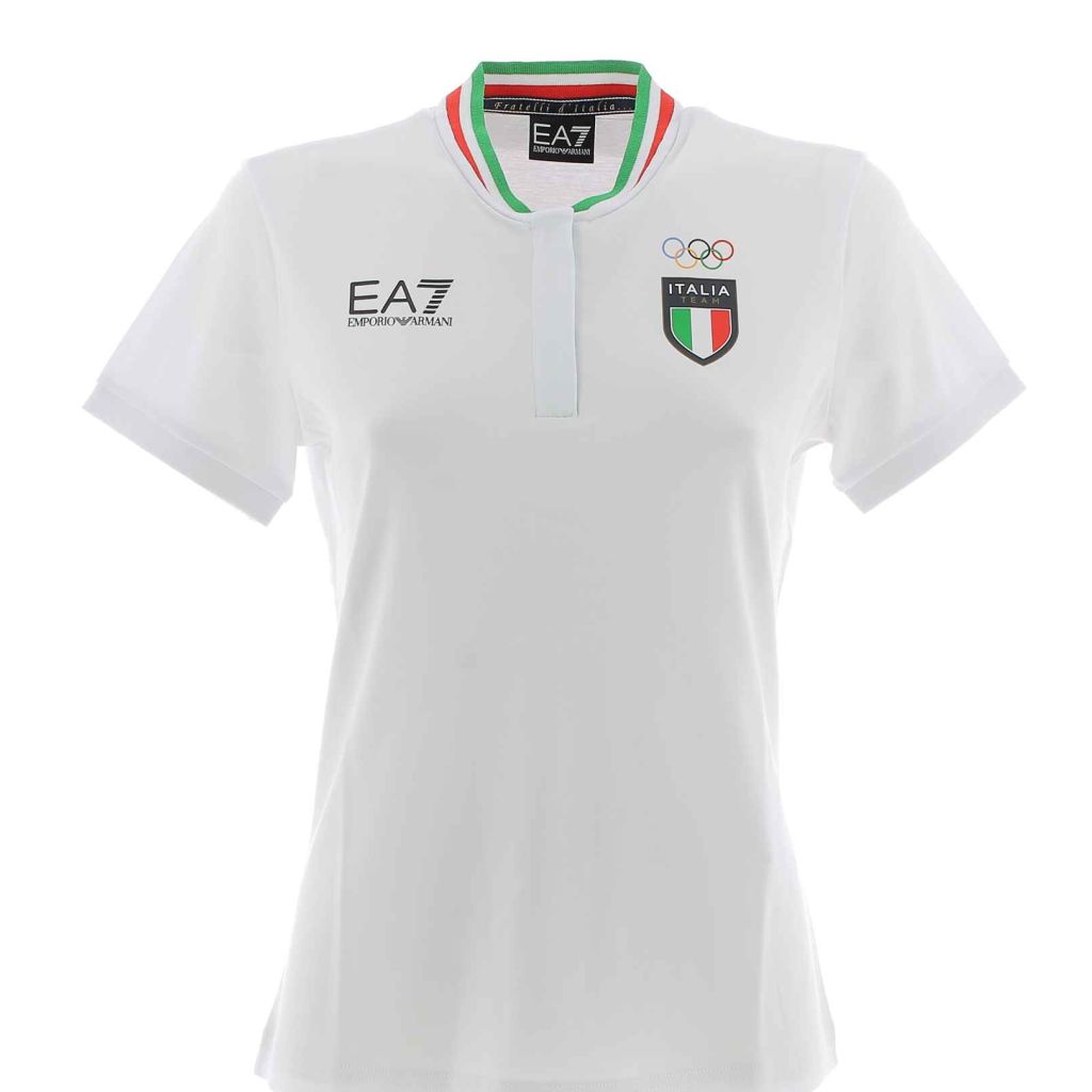 Polo Jersey Donna con Zip senza colletto EA7 Emporio Armani Olimpiadi 2024. I colori della bandiera Italiana sono presenti intorno al