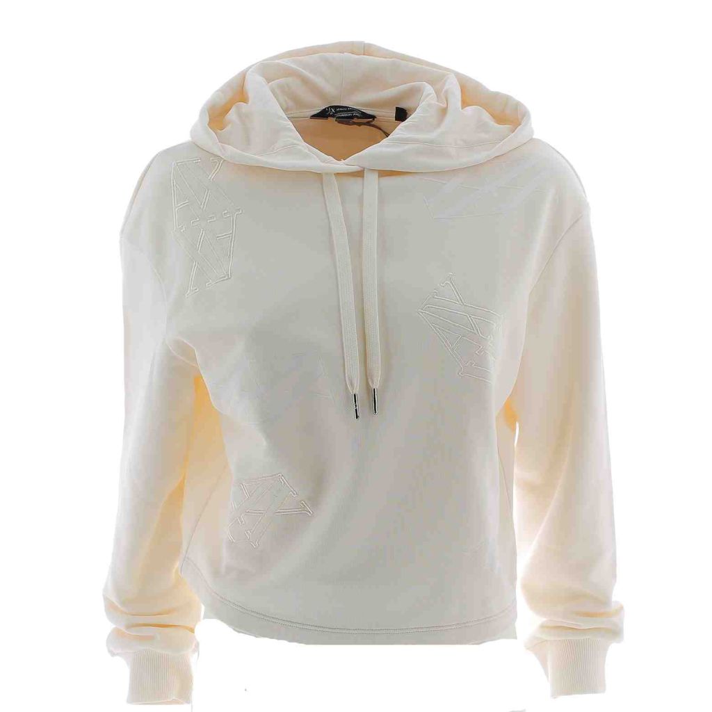 Felpa Crop Garzata Cappuccio Chiuso A|X Armani Exchange Donna. Polsini Alla Fine Delle Maniche Elasticizzati Loghi A|X Ricamati nella Parte Centrale. La Felpa ha un Taglio Dritto e il Cappuccio Dispone di Tiralacci Regolabili. Il Tessuto e' Composto al 100% in Cotone e la Felpa e' in Tinta Unita di Colore Panna