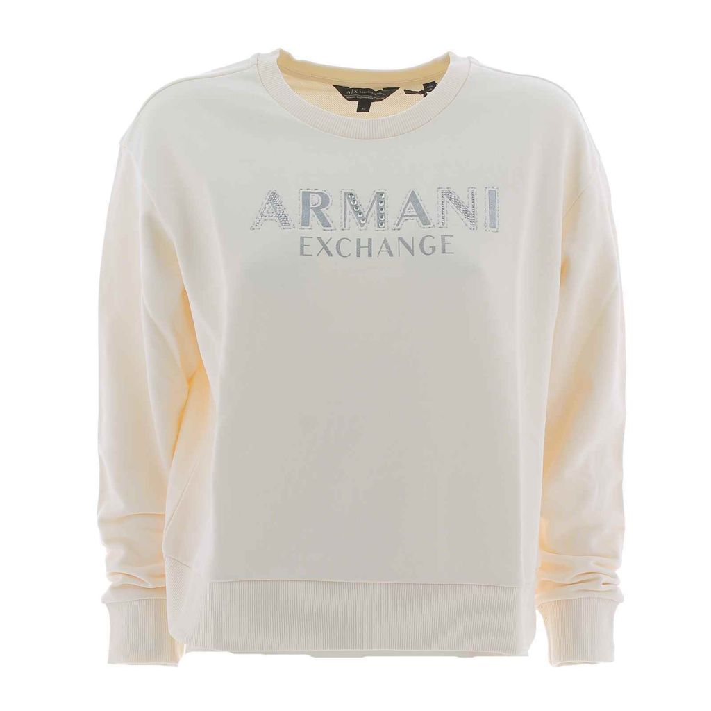 Felpa Girocollo Garzata Donna con Logo posto al cengtro della Felpa A|X con Strass, Tinta Unita A|X Armani Exchange. Il Fascione in vita e i polsini alla fine delle maniche sono elasticizzati. Il Tessuto e' al 100% di Cotone.