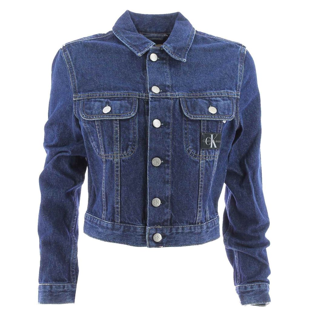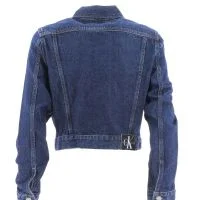 Giubbotto crop in jeans stone wash blu da donna Calvin Klein. La giacca dispone di logo CK posto a sinistra e due tasche con bottone logato CK poste al centro della giacca. Nella parte posteriore si trova il logo CK e i polsini sonochiusi con bottone logato CK. Il tessuto jeans e' al100% in cotone