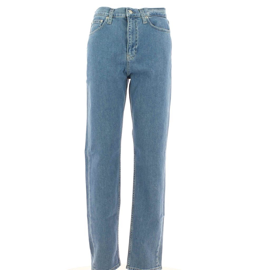 Pantalone Jeans Calvin Klein Tinta Unita Modello Authentic Slim Straight Leggermente Elasticizzato Due Tasche Posteriori Tre Tasche Laterali Blu Stone Wash Donna 99% Cotone, 1% Elastain