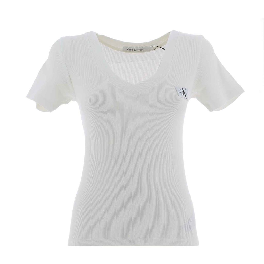 T Shirt Giro Collo Calvin Klein Tinta Unita Logo CK Posto a Sinistra Della T Shirt Leggermente Elasticizzata Tessuto a Costine Manica Corta Scollo a V Uomo 94% Cotone, 6% Elastain