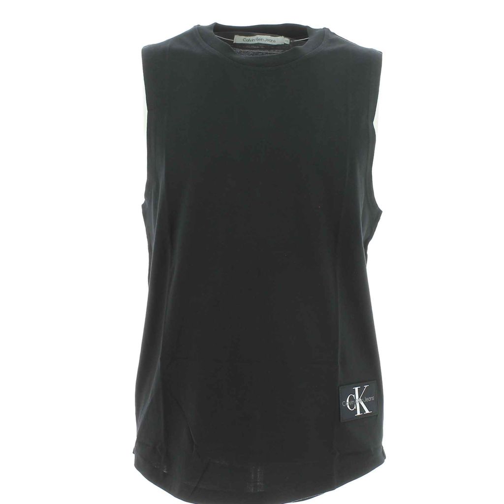 T Shirt uomo senza maniche a giro collo Calvin Klein. La t shirt ha il logo CK con patch ricamata posto sul fondo della T Shirt posto nella parte sinistra. Il tessuto e' leggermente elasticizzato in tinta unita e al 100% in cotone.