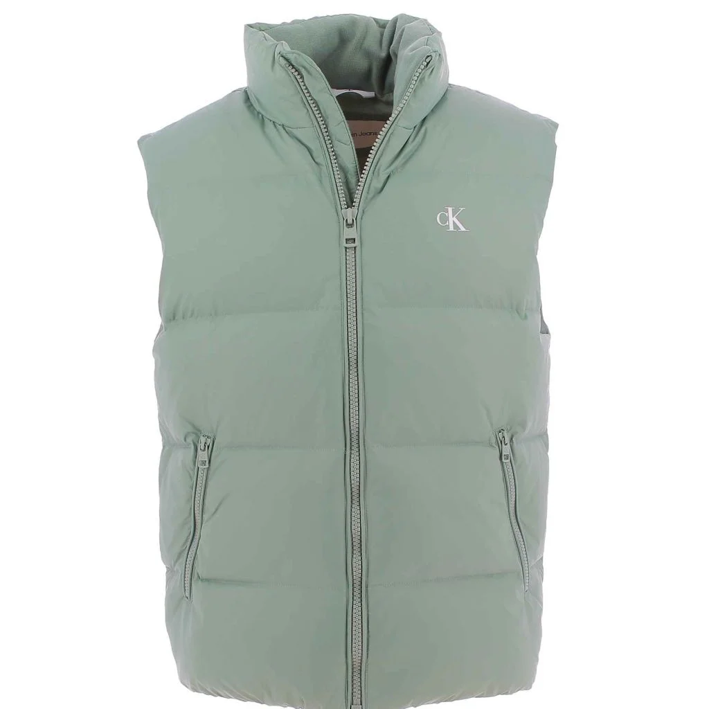 Gile' in piuma Calvin Klein uomo. Il gile' dispone di due tasche laterali chiuse con zip e una tasca interna chiusa con bottone, una apertura centrale con zip e logo CK posto a sinistra. Il tessuto esterno e' 100% poliamide mentre l'imbottitura e' 70% pima d'natra.