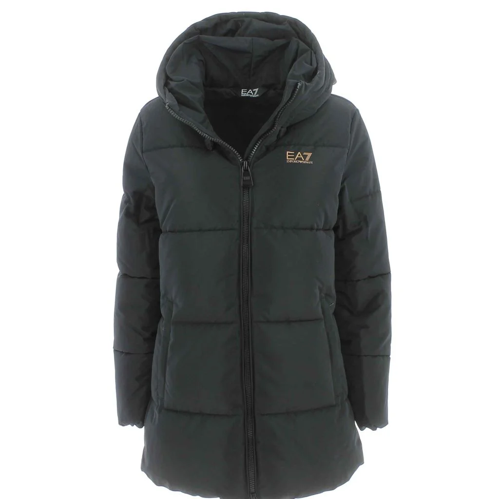 Giacca Donna Con Cappuccio EA7 Emporio Armani Tinta Unita Nera. La Giacca Dispone di Due Tasche Laterali con Zip, Apertura Centrale con Doppio Cursore. Il Cappuccio e' Regolabile con Tiralacci e il Logo EA7 e' Posto a Sinistra. Il Tessuto Esterno e' 100% Poliesterementre l'imbottitura e' in Thermore