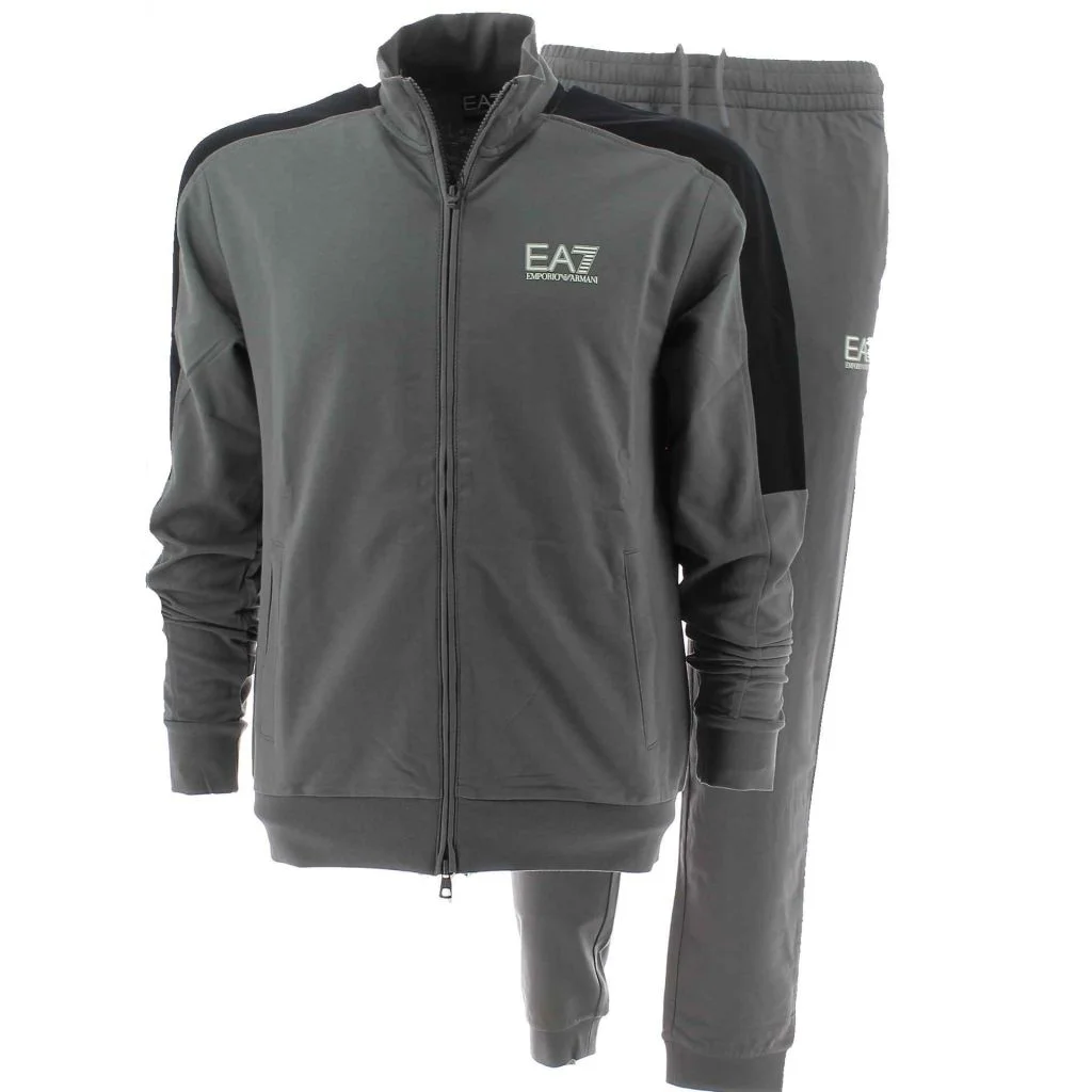 Tuta in Felpa Garzata Full Zip EA7 Emporio Armani in Grigio/Nero. La Felpa ha il logo EA7 posto a sinistra e un grande Logo EA7 nella parte posteriore, dispone di due tasche laterali e il fascione sul fondo della giacca e i polsini sulle maniche sono elasticizzati. La zip della Giacca ha due cursori per poterla aprire anche dal basso. Il Pantalone dispone di Coulisse con Tiralacci per poter regolare la vita, due tasche laterali e sul fondo del pantalone sono presenti polsini elasticizzati. Il Tessuto e' composto da 100% di cotone